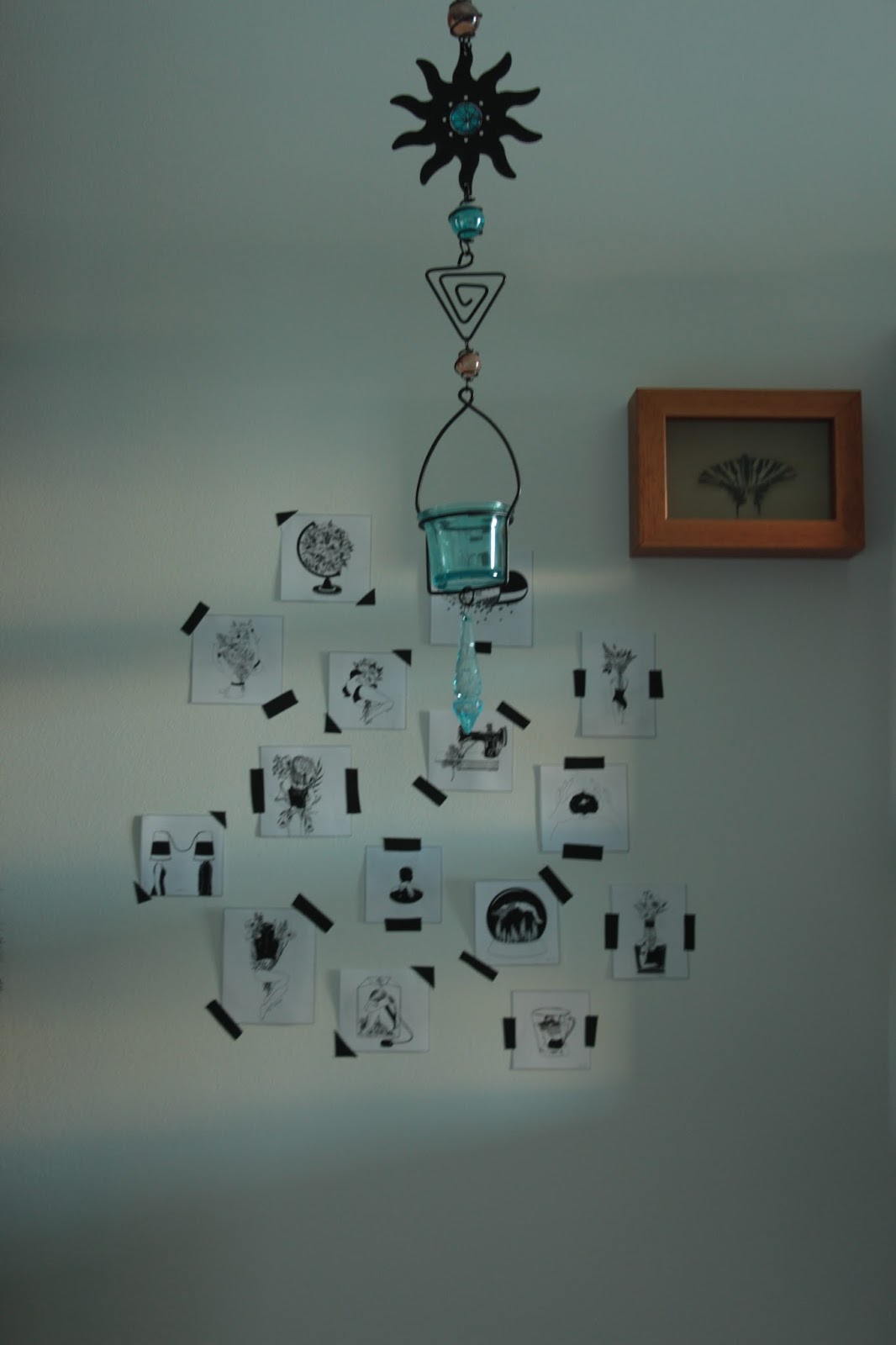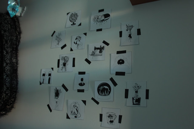 Depois de recortar as imagens, é só dispô-las numa parede da forma que mais agradar e cola-las com fita cola preta. Eu usei fita tesa porque foi a única coisa que encontrei.