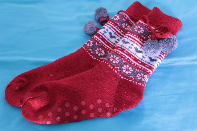 Estas são as meias que costumo usar quando estou por casa. Para além do ar natalício são mesmo muito quentinhas e têm borrachinhas anti derrapantes.